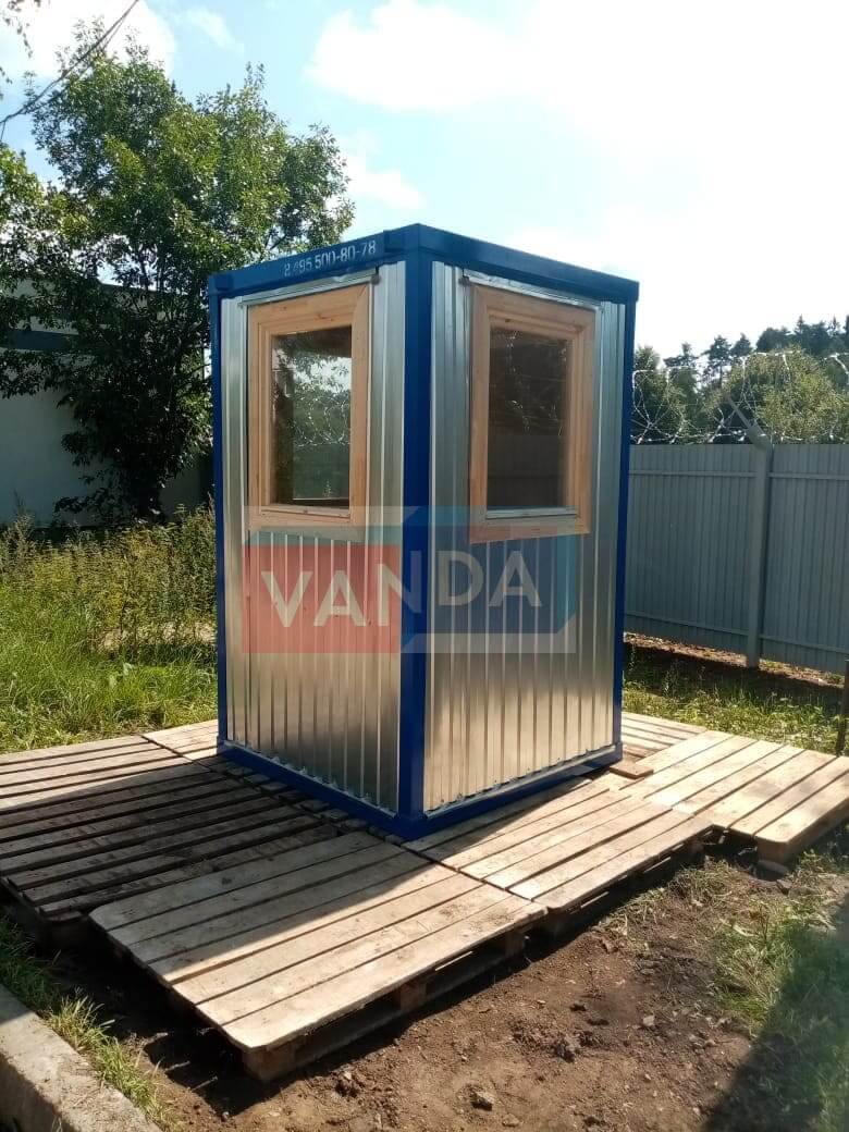 Пост охраны №1 (вариант 1) изготавливается из несущего каркаса (верхняя и нижняя обвязка): швеллер 100х50х3 мм., угловые стойки: сложно - гнутый угол 90х90х3 мм., крыша блок-контейнера: металл сварной 0,9-1 мм., качественная наружная отделка: оцинкованный профлист, вспомогательный деревянный каркас (стены) выполнен из брусок 40х75 мм., лаги пола: обрезная доска 40х100 мм., лаги потолка: обрезная доска 40х100 мм., выполнено утепление: Минеральная вата «ISOVER» – 50 мм. и пароизоляция: плёнка техническая, черновой пол состоит из: обрезная доска 20 мм. (2 сорт), чистовой пол покрыт: ДСП строительное 16 мм., отделка пола выполнена из качественных материалов. Контейнер комплектуется окнами: деревянное, двойное остекление 800х1000, входной дверью: ДГ 21-8 обшита снаружи оцинкованным листом, врезной замок и внутренними дверями. Если в БК присутствуют перегородки, то для них используется: брусок 40х50 мм.